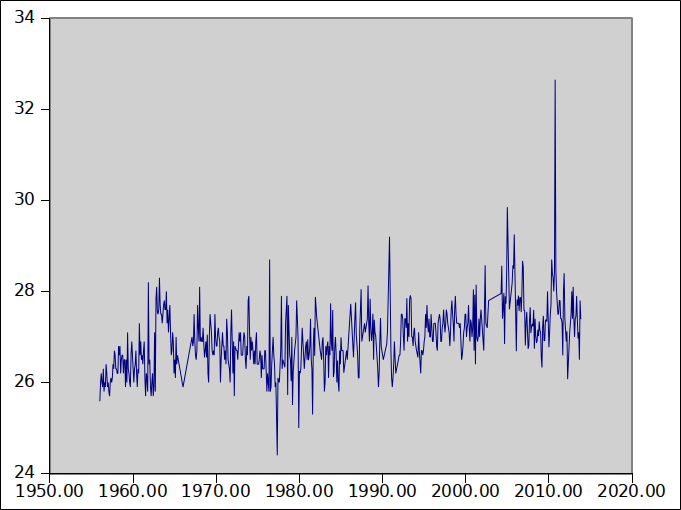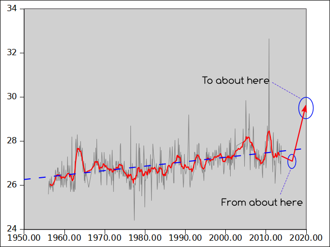 Since we don't know what the apparently bad data should be, just ignore the graph before Sept 2013. The Oct. 2013 claim was that terror would be unleashed here by 2020. How's it going? It's purely a matter of personal opinion, but it doesn't look scary to me.