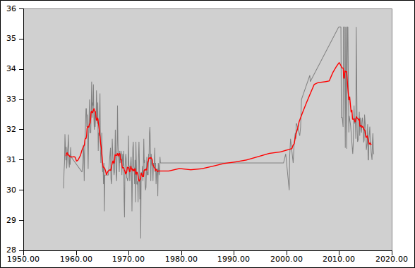 The grey line is the data, the red line a 12-month running average. The long straight bits on the grey line are missing data. You can probably see the outcome already, but let's amplify the last part where the supposed "end of the world" disaster is developing: