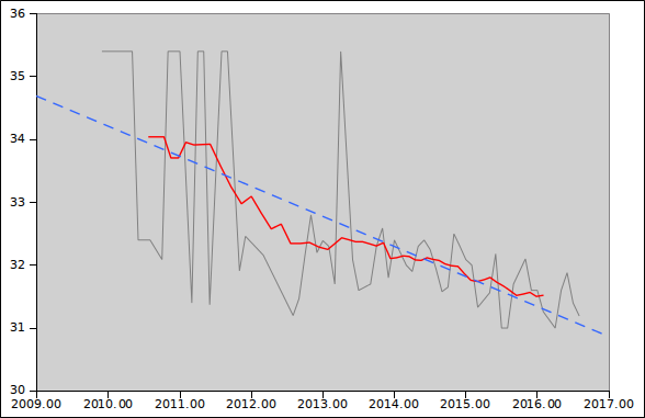 And if you start from the middle of 2012, and exclude the 35.4C peak, the trend is flat. Your dotted blue line, what happens to it if you remove the 35.4C peaks? Do you think the new version this would create, or what is indicated on your graph right now would be more likely to reflect reality?
